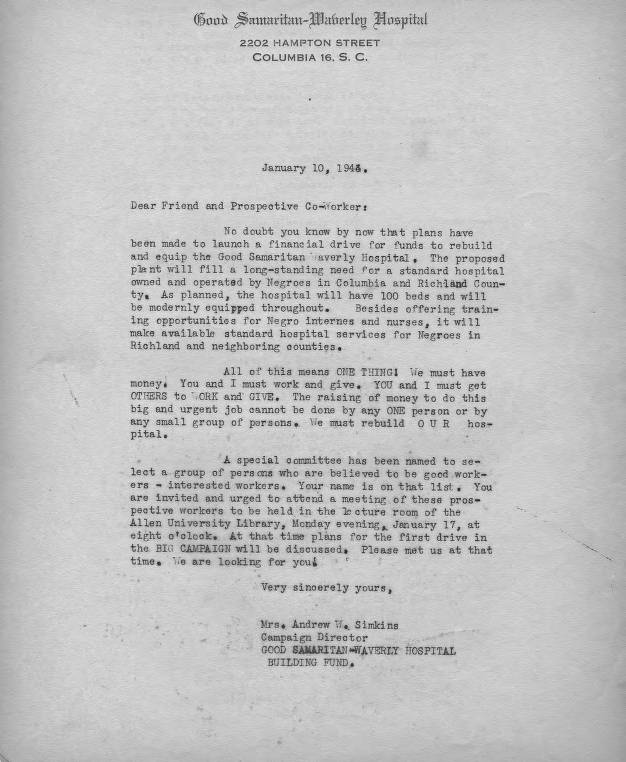 Letter about Fundraising for Good Samaritan-Waverly Hospital, January 10, 1944
